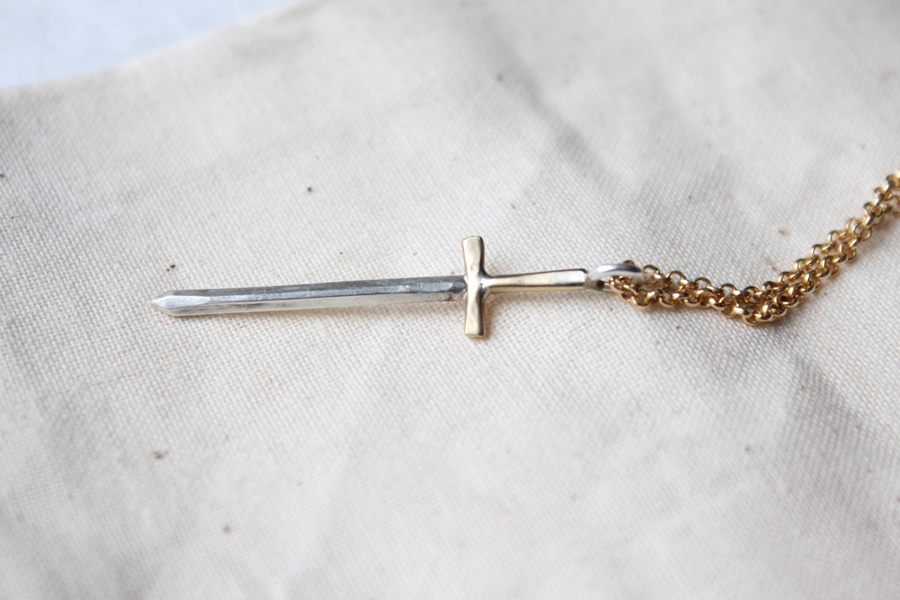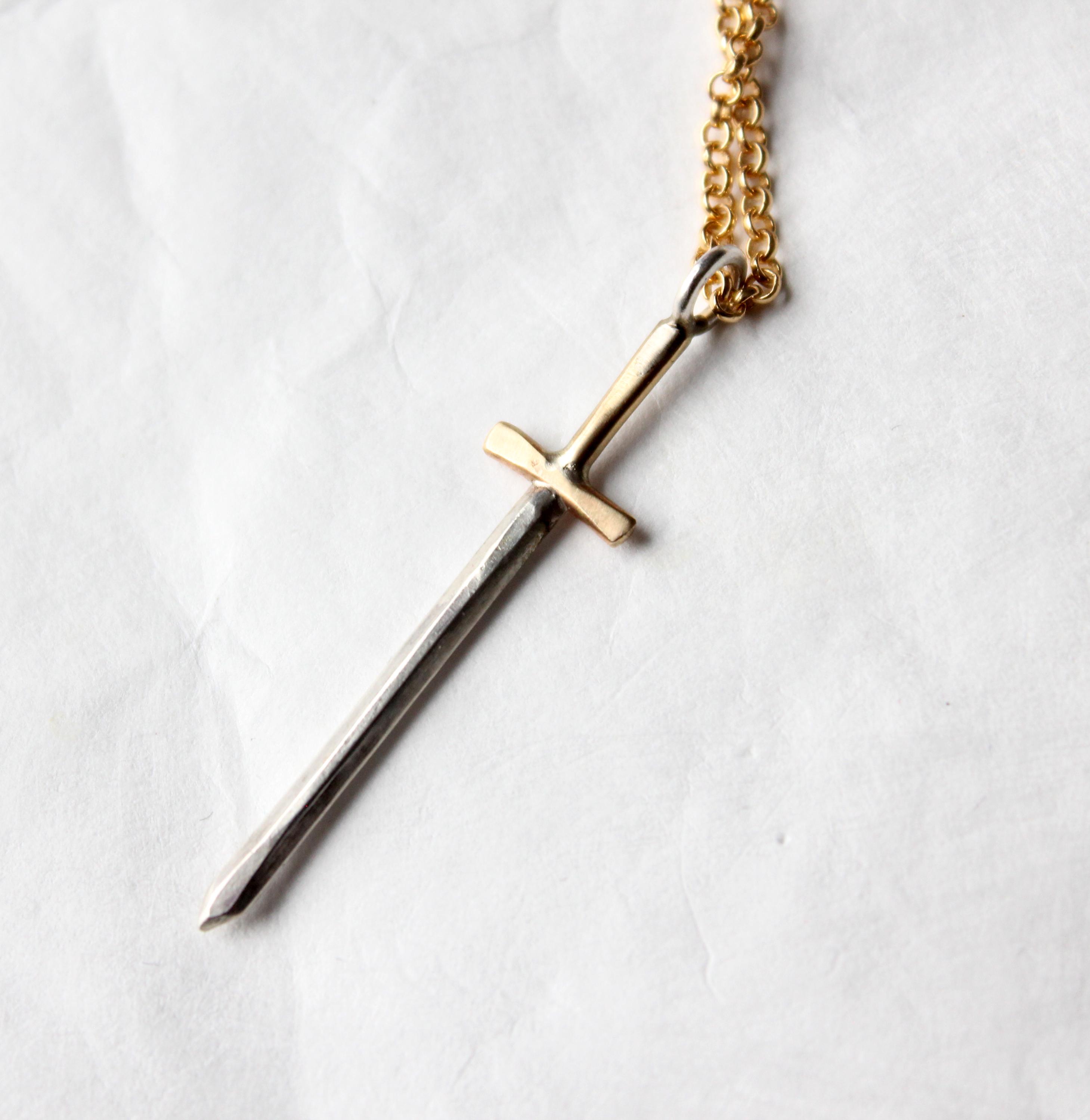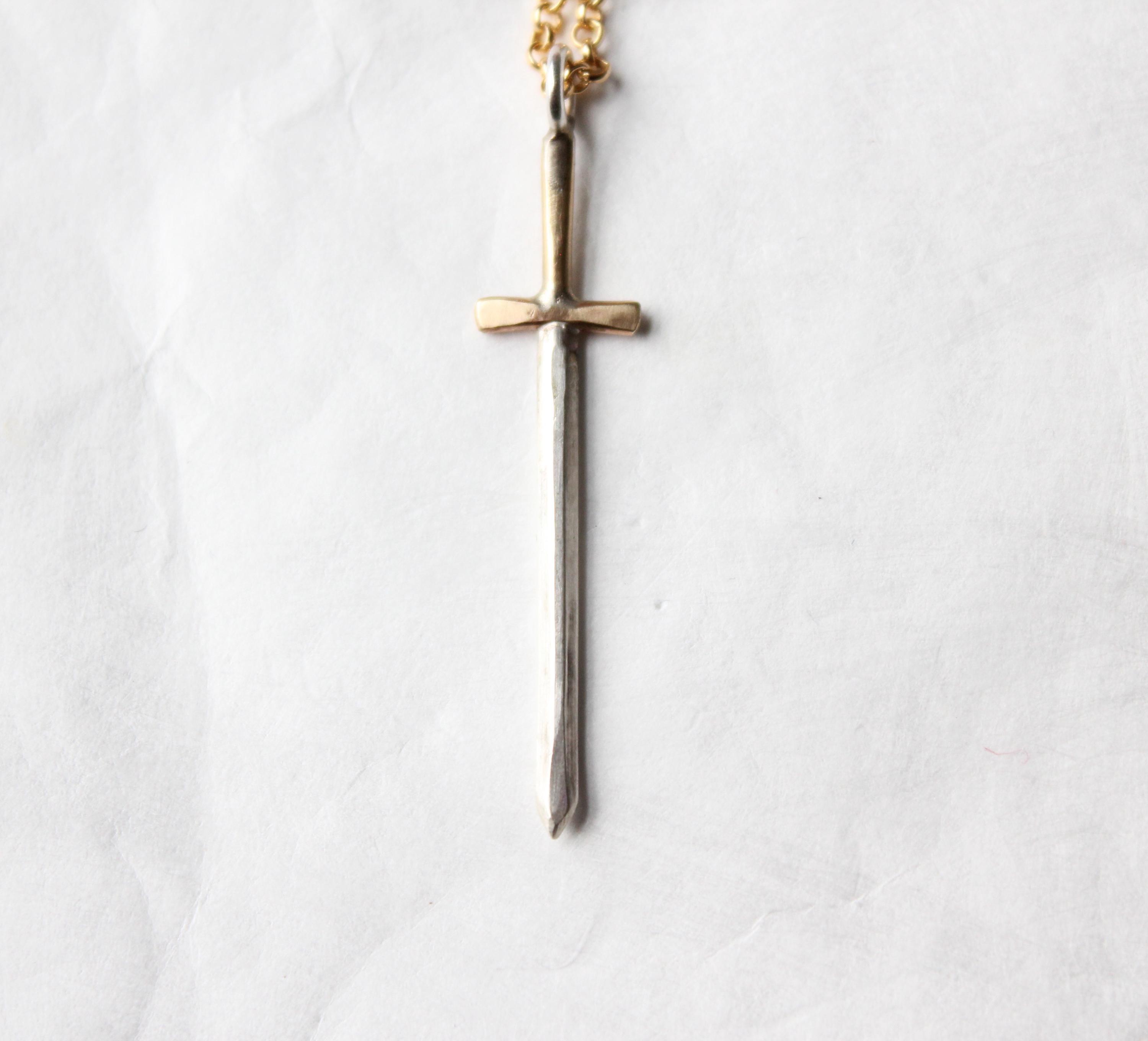 I carefully hand form, solder, and finish solid sterling silver into a small sword pendant. The "handle" of the sword is crafted in solid 14K gold for contrast. The loop is silver.
