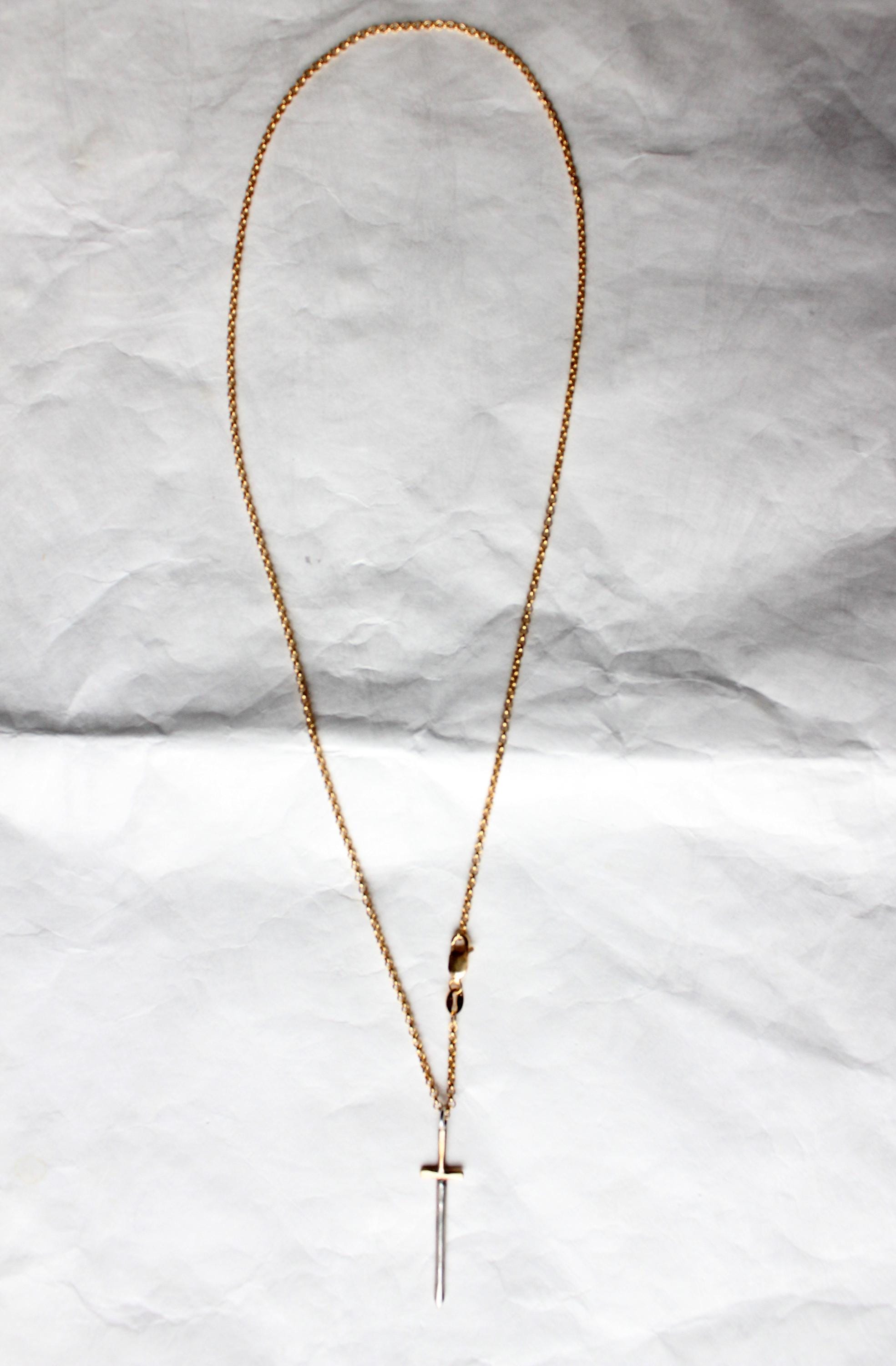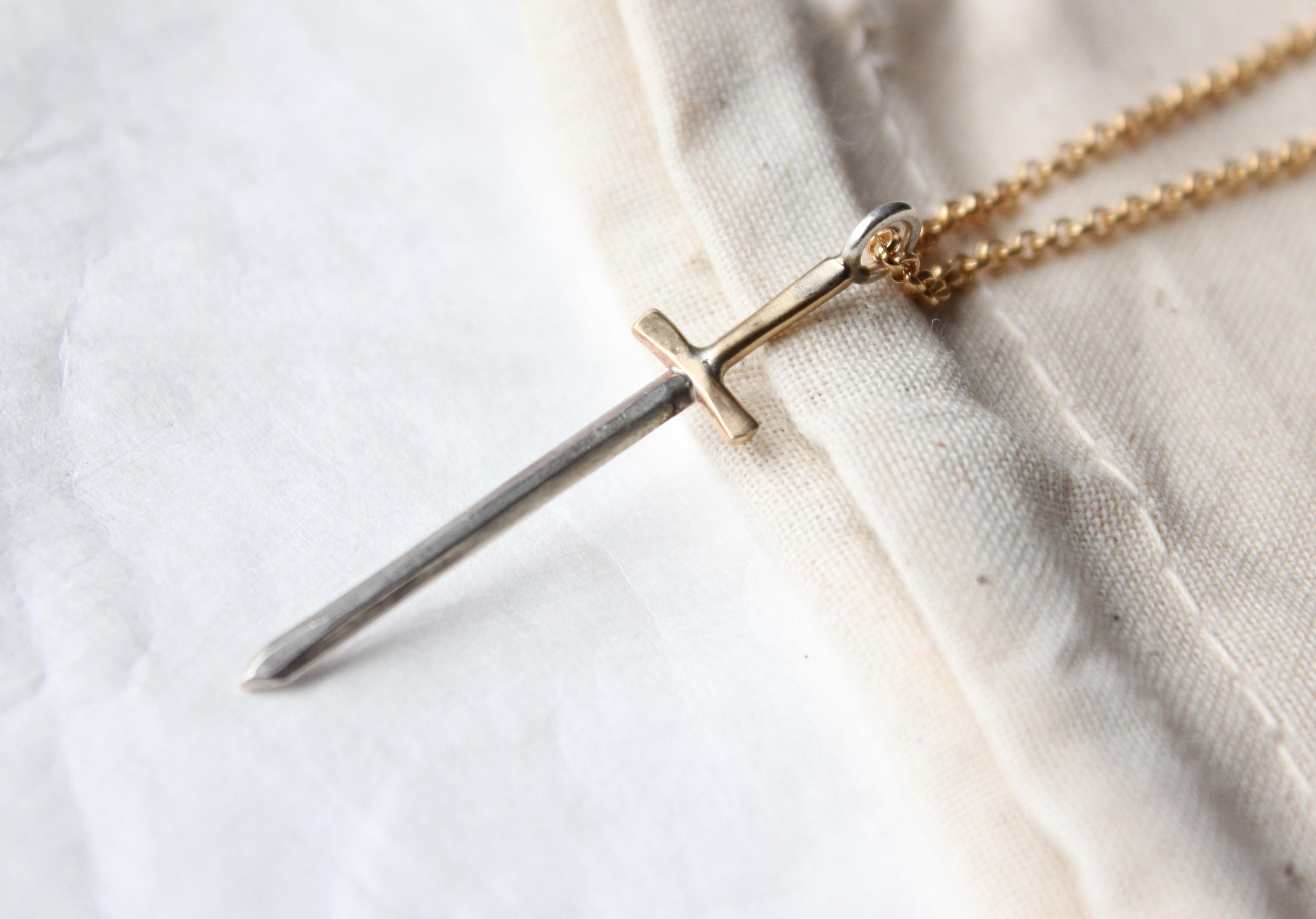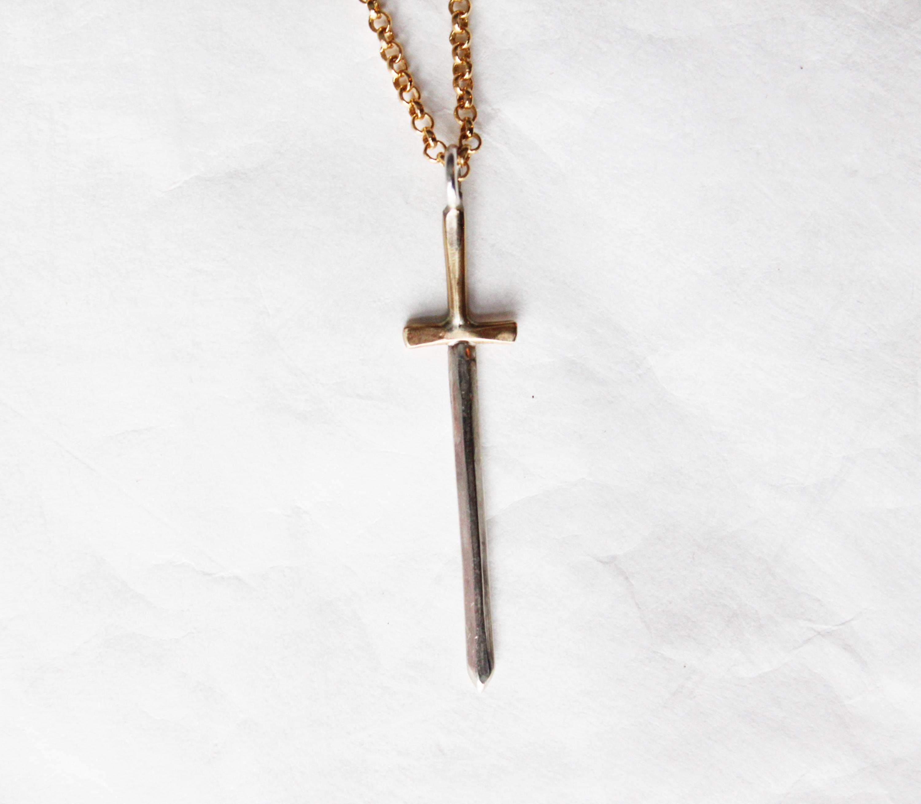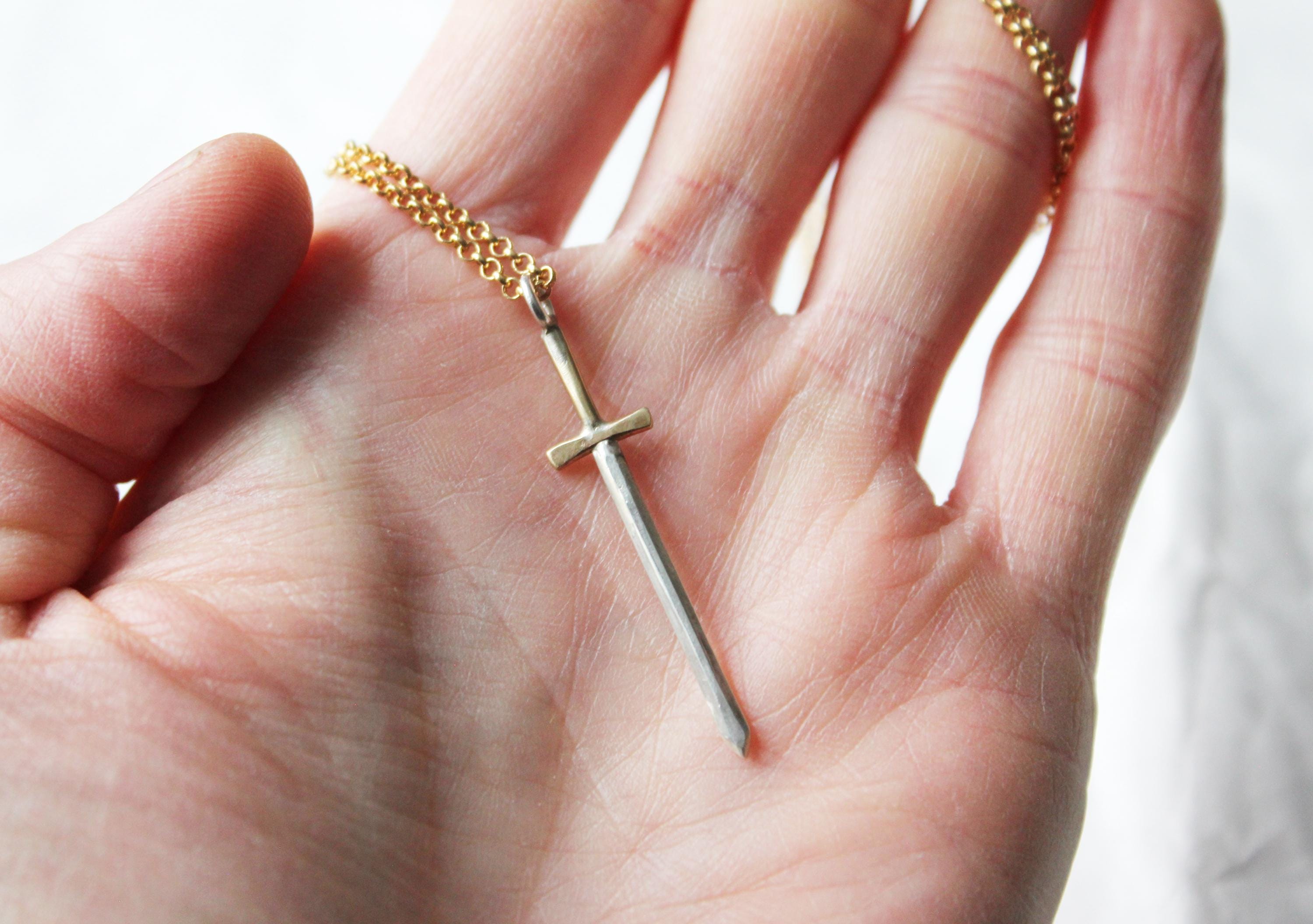 I carefully hand form, solder, and finish solid sterling silver into a small sword pendant. The "handle" of the sword is crafted in solid 14K gold for contrast. The loop is silver.