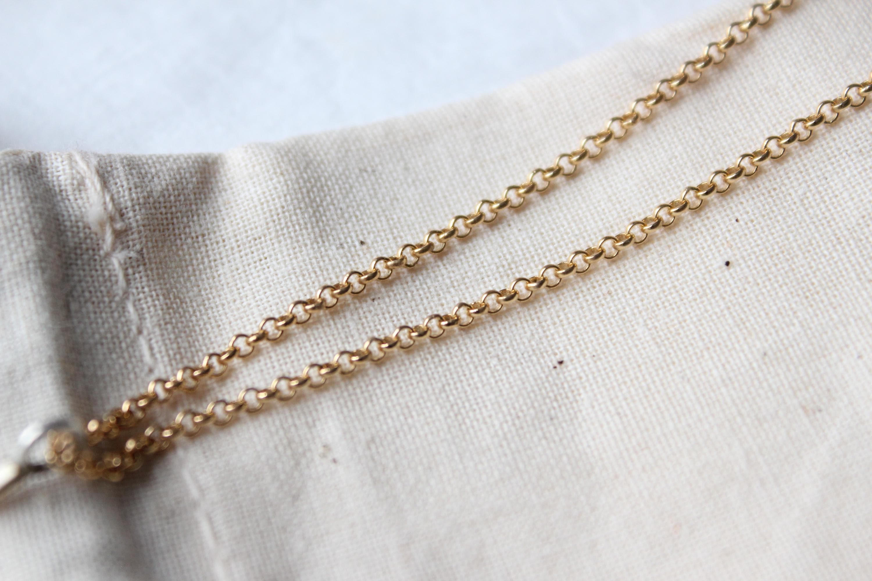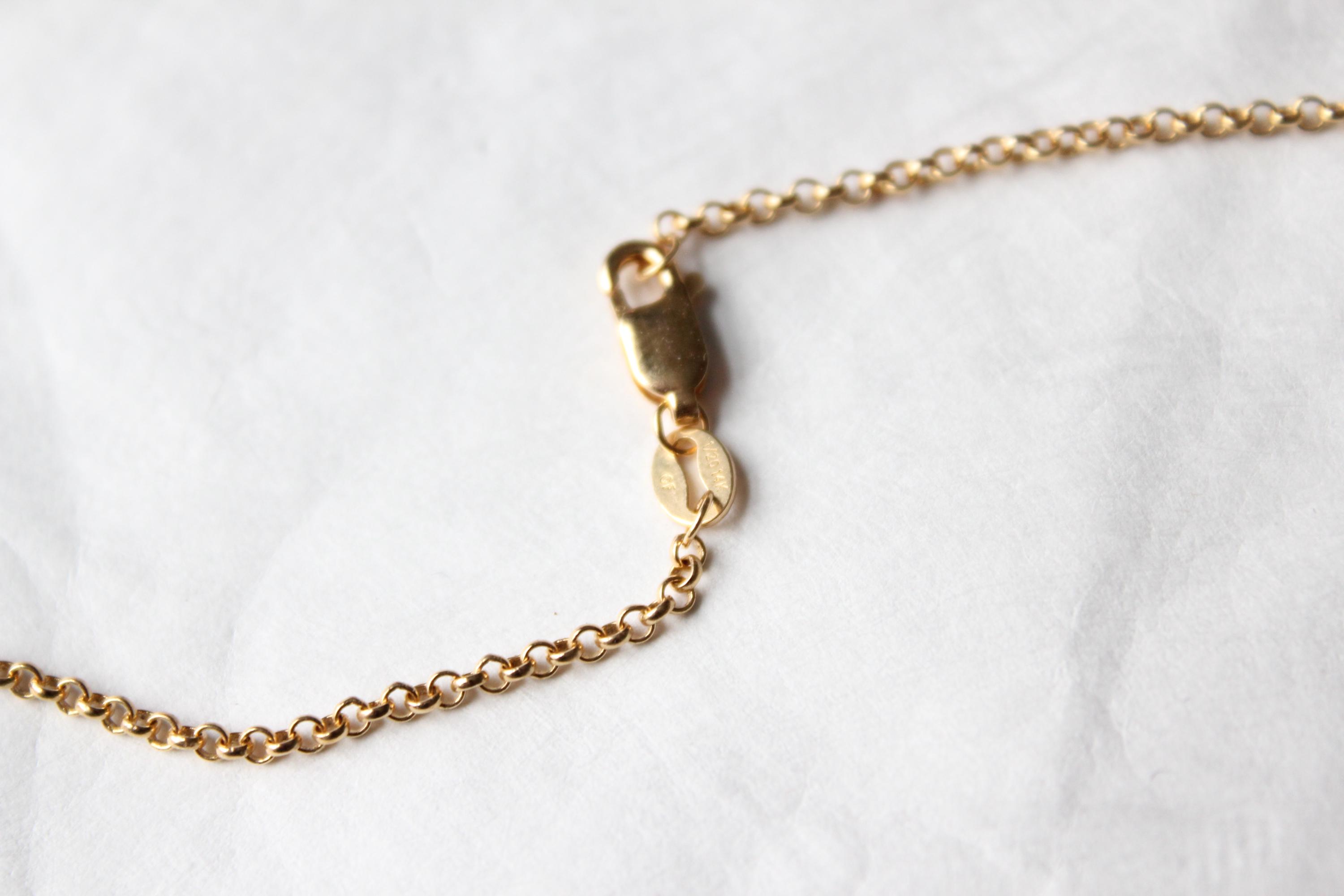 It hangs on a 14/20 Yellow Gold-Filled chain approximately 20" in length with a lobster claw clasp.